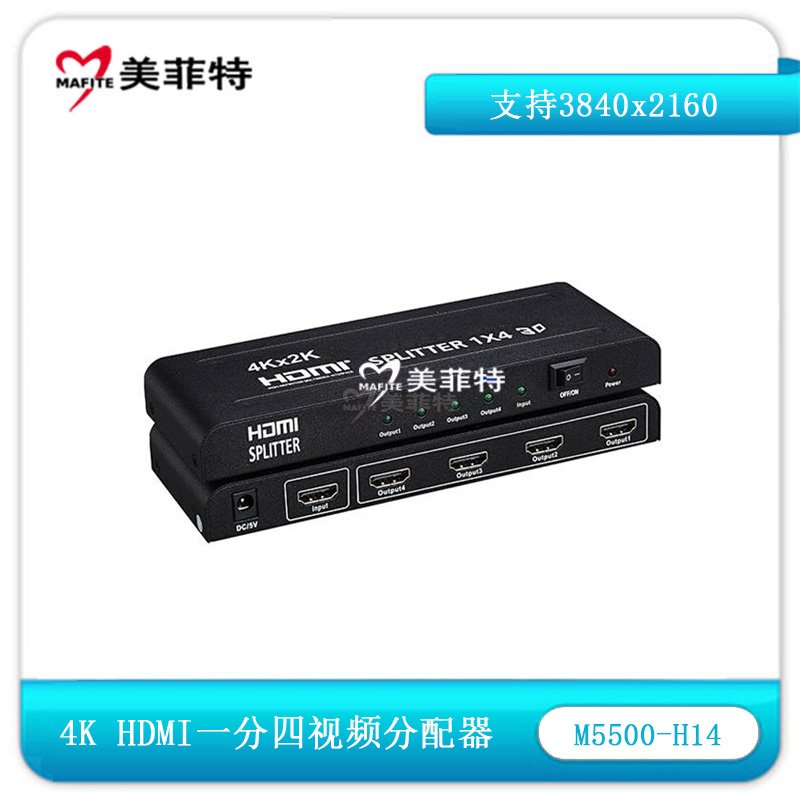 美菲特H5500-H14 这款1x4 HDMI分配器可以把1个高清信号源连接到4个高清显示终端。它可以很容易地将1路高清信号源所产生的高清信号分配到4台支持高清信号的显示器或者投影机上。另外,把它接在一根HDMI线的信号输出端时,可对HDMI信号进行放大。此HDMI分配器可以支持分辨率可达3840X2160/30HZ。