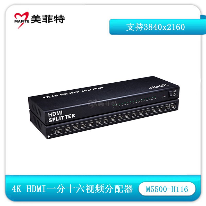 美菲特M5500-H116 这款1x16 HDMI分配器可以把1个高清信号源连接到16个高清显示终端。它可以很容易地将1路高清信号源所产生的高清信号分配到16台支持高清信号的显示器或者投影机上。另外,把它接在一根HDMI线的信号输出端时,可对HDMI信号进行放大。此HDMI分配器可以支持最大分辨率可达3840X2160/30HZ。