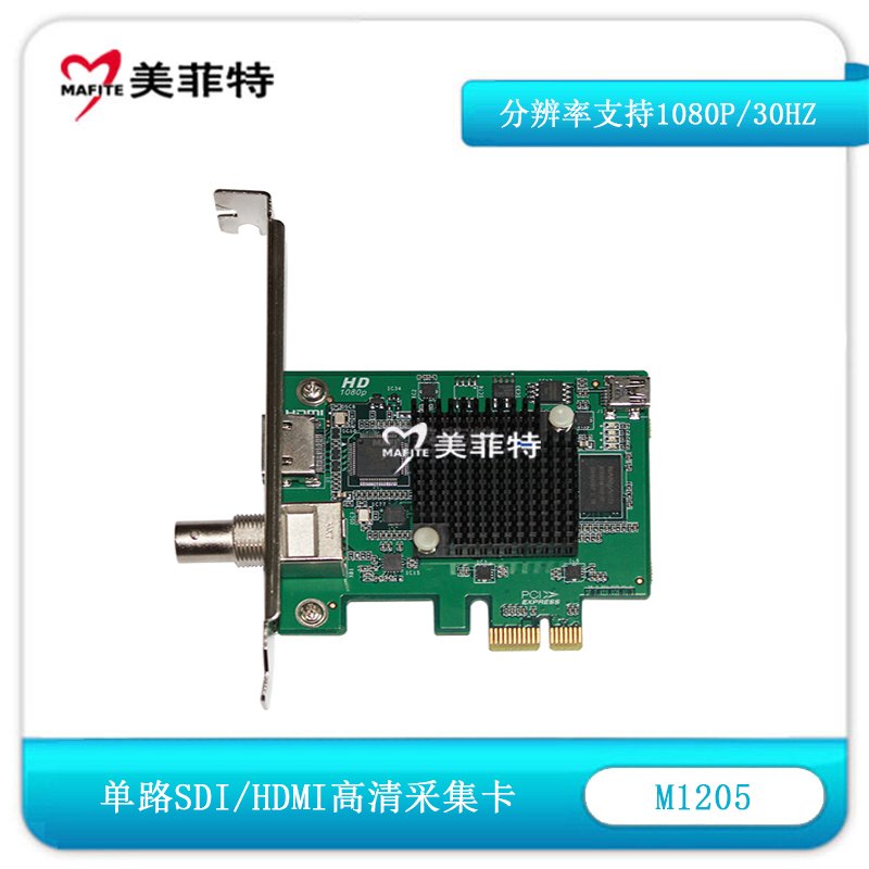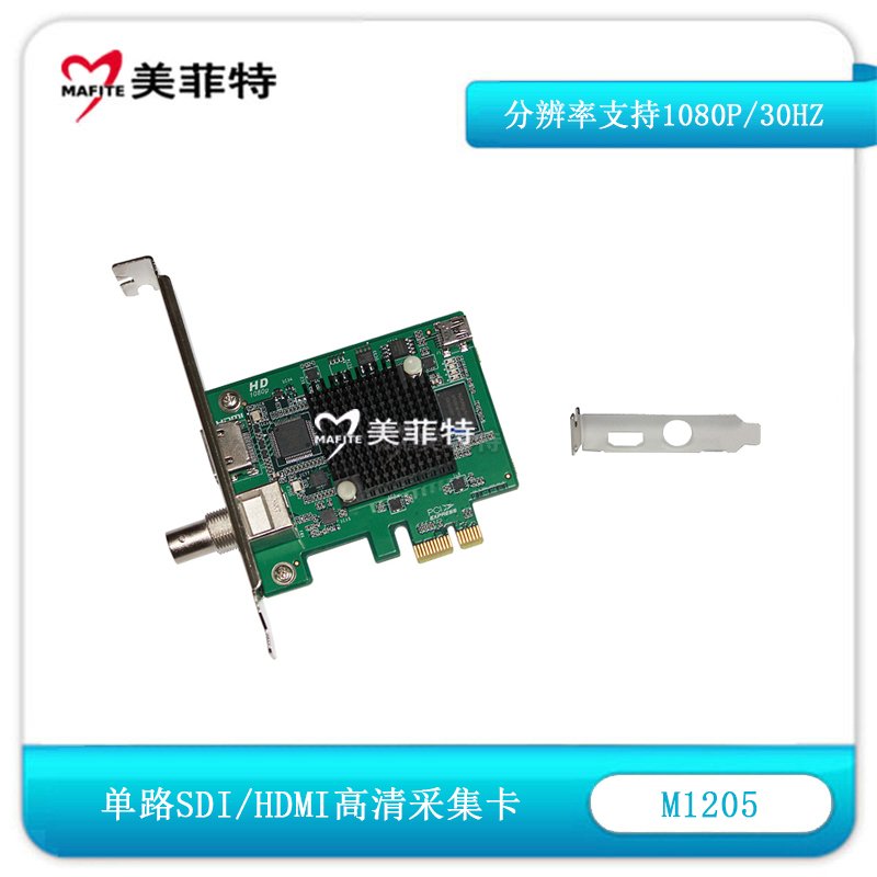 美菲特M1205是一款单路SDI/HDMI高清采集卡,可以采集1路SDI或1路HDMI高清信号,HDMI和SDI两种信号任选其一,卡上有两个接口:1个HDMI接口和1个SDI接口,带一个小档板,支持小机箱,PCI-E1.0 X1,分辨率可以达到1080P/30HZ,带SDK开发包,同时支持微软Directshow进行开发