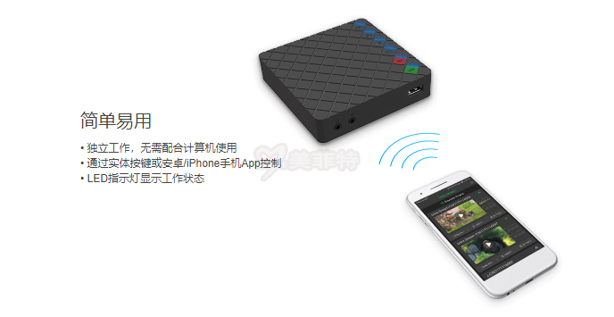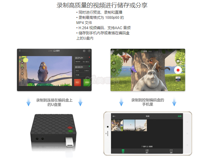 1、在录制方面:可以录制1路HDMI信号和1路麦克风的音频信号到本地USB移动存储设备里:U盘/移动硬盘等,同时能通过手机APP录制到手机里。