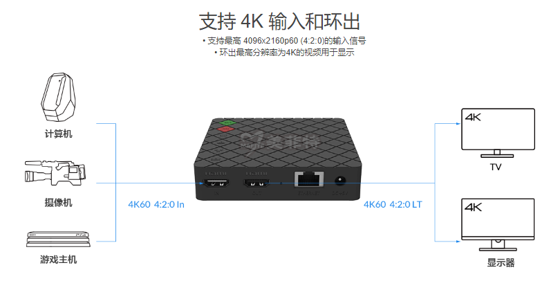 · 最高支持 4096x2160 4:4:4/4:2:2 30fps 或 4096x2160 4:2:0 60fps 信号输入和环出
