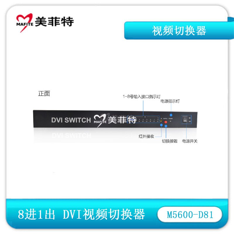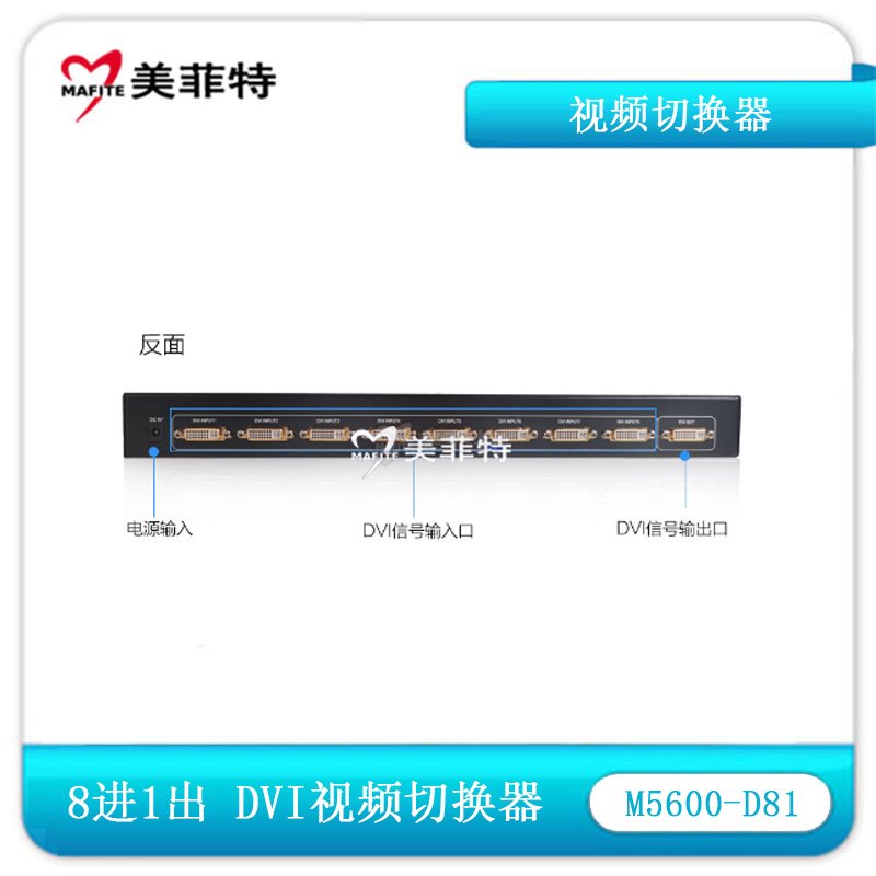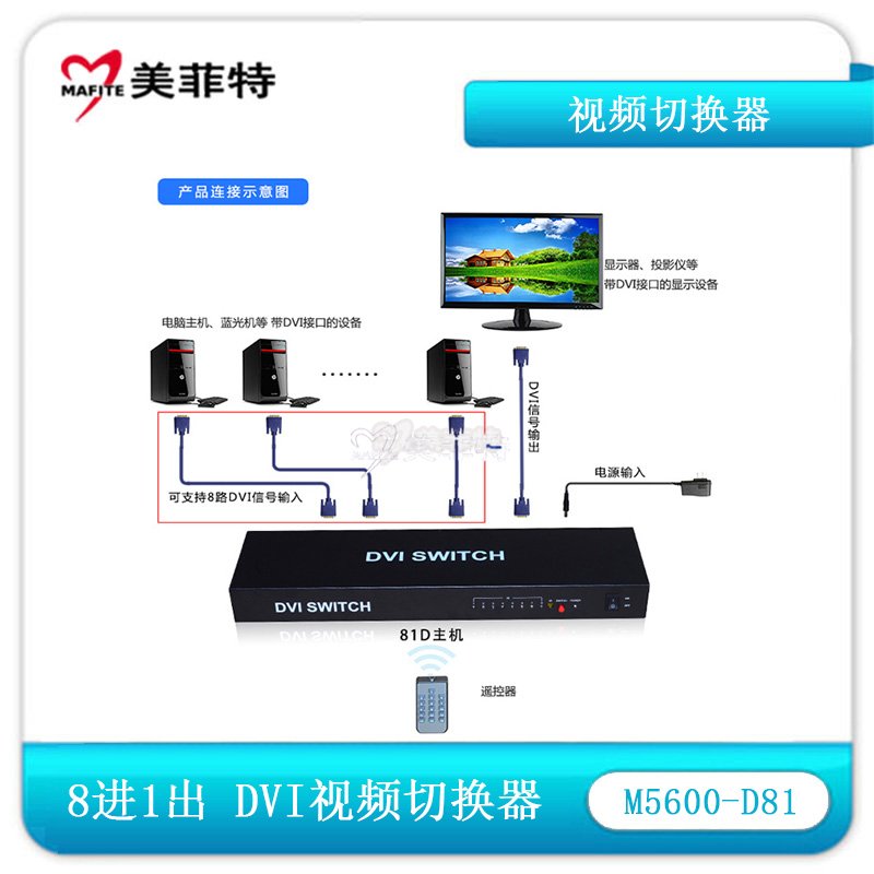 1. 工业级产品,DVI八进一出切换器,带遥控,八路DVI信号输入,一路DVI信号输出