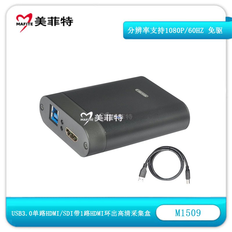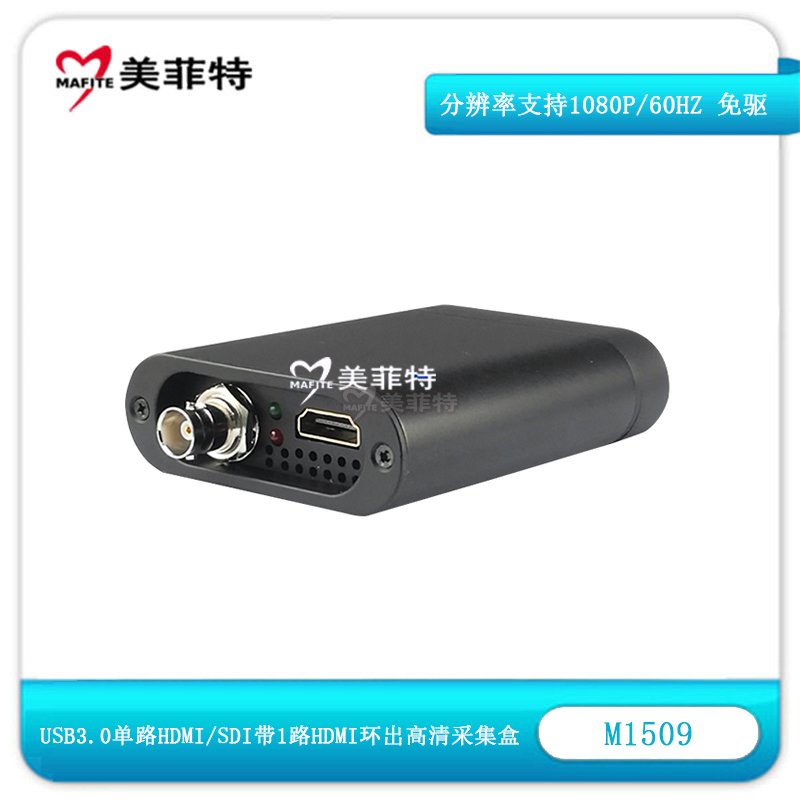 美菲特M1509是一款USB3.0免驱单路SDI/HDMI高清采集盒,同时带1路HDMI环出,可以采集1路SDI或HDMI高清信号,同时环出1路HDMI信号,盒子上有2个输入视频口:1个SDI视频口和1个HDMI视频口,还有1个HDMI环出口,两个视频输入接口任选其一,如同时接上,优先是SDI信号,带一条USB3.0转接线,分辨率可以达到1080P/60HZ,免驱,不需装驱动。