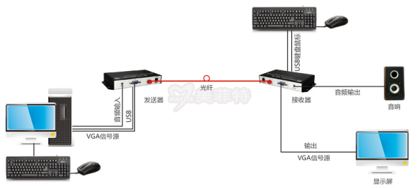 发送器,接收器,二个设备配合使用,可实现经发送器器把VGA、Audio、键盘鼠标信号经光纤长距离发送给光接收器,特别适用于控制中心、教育、医疗、电力、保密系统的KVM长距离传输应用。