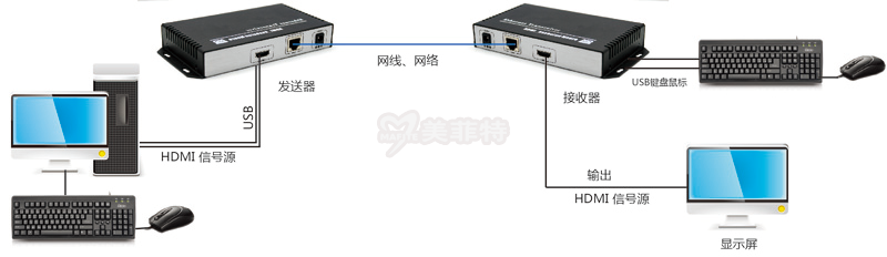 发送器,是接收器,二个设备配合使用,可实现经发送器器把HDMI、键盘鼠标信号经网线、网络发送给接收器,特别适用于控制中心、教育、医疗、电力、保密系统的KVM长距离传输应用。