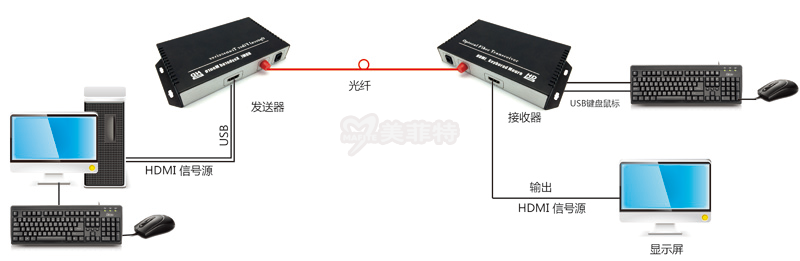 此外, 此款设备可以在远端控制操作本地的主机,有效的保护了内部信息不被拷贝、外泄。 发送器,接收器,二个设备配合使用,可实现经发送器器把HDMI、Audio、键盘鼠标信号经光纤长距离发送给光接收器,特别适用于控制中心、教育、医疗、电力、保密系统的KVM长距离传输应用。