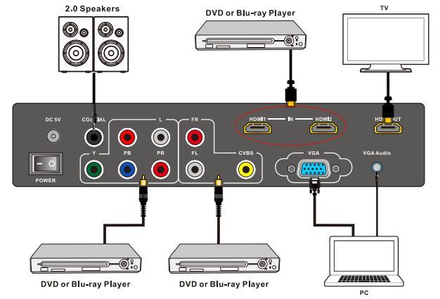 通过HDMI线把信号源与多媒体切换器HDMI输入口连接起来